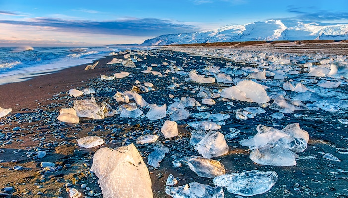 Just across the road from the lagoon, glittering ice chunks wash ashore on jet-black sands, a postcard-perfect spot for photos at sunrise or sunset.
