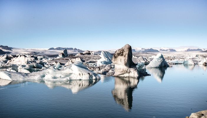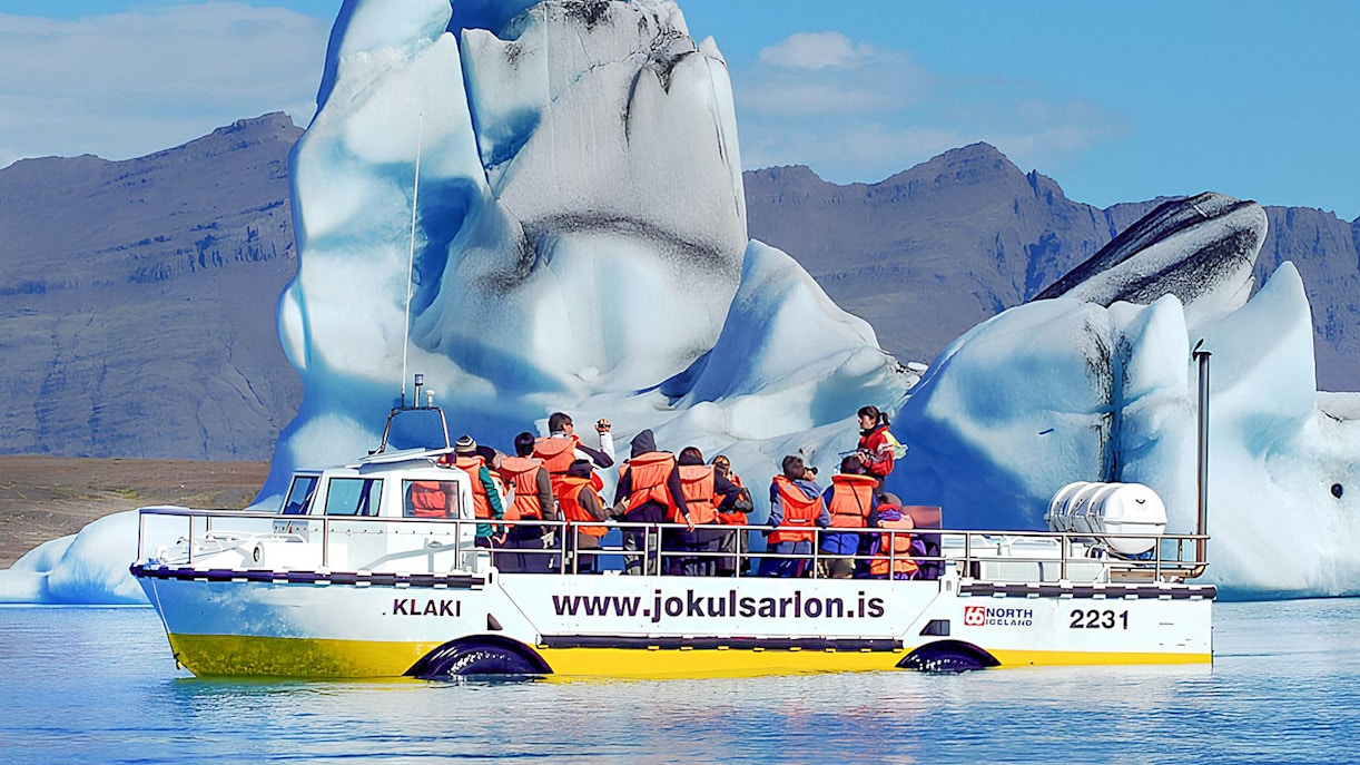 A surreal lake filled with icebergs calving from Breiðamerkurjokull glacier. Watch shimmering blue ice drift past, listen to gentle crackles, and spot seals swimming between the bergs.